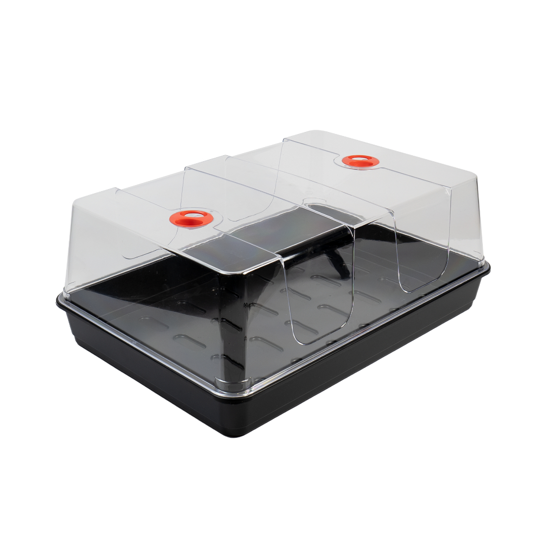 The Garland High Dome Propagator has a sturdy, injection moulded tray with strong rims has generous depth allowing for healthy plant development. The higher than average clear plastic lid is made from a superior, shatterproof plastic. The base tray does not feature drainage holes, given that most users opt to fill the unit with smaller trays or pots or multi cell inserts.