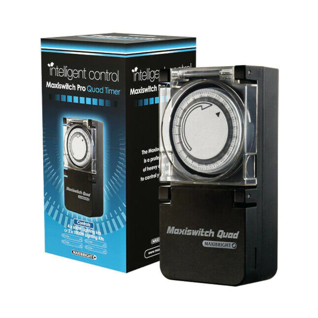 The Maxiswitch Pro Quad heavy duty timer is the only plug in timer that will switch 13A of all types of lighting. Simply use with a good quality extension lead then you can switch multiple lights up to 13A