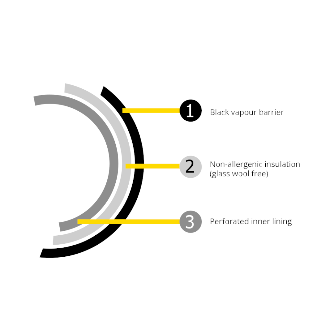 PhonicTrap was designed in Europe for the heating, ventilation and air conditioning (HVAC) industry and consistently outperforms other ducting products. It is manufactured to conform to Reach certification and, for this reason, it’s made from extremely high quality materials. There are three layers of ducting and each has been selected to help do two things: reduce noise and maximise airflow.